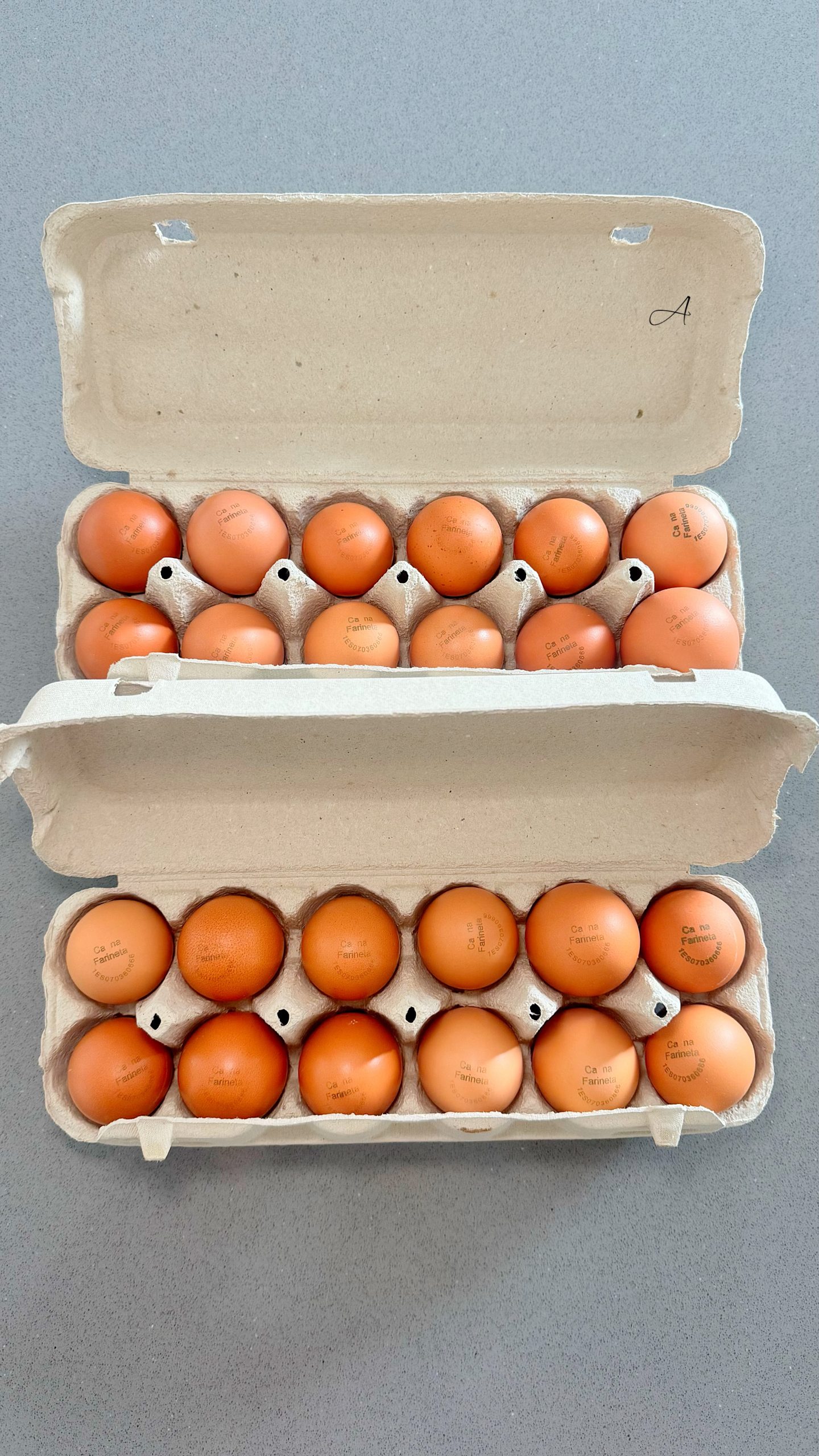 Los huevos vienen en tamaños variados, porque en la granja no los clasifican: cada uno llega tal cual lo pone la gallina. Y esa autenticidad tiene sus sorpresas… ¡a mí, por ejemplo, me tocó un huevo enorme que escondía dos yemas dentro, ambas increíblemente sabrosas!