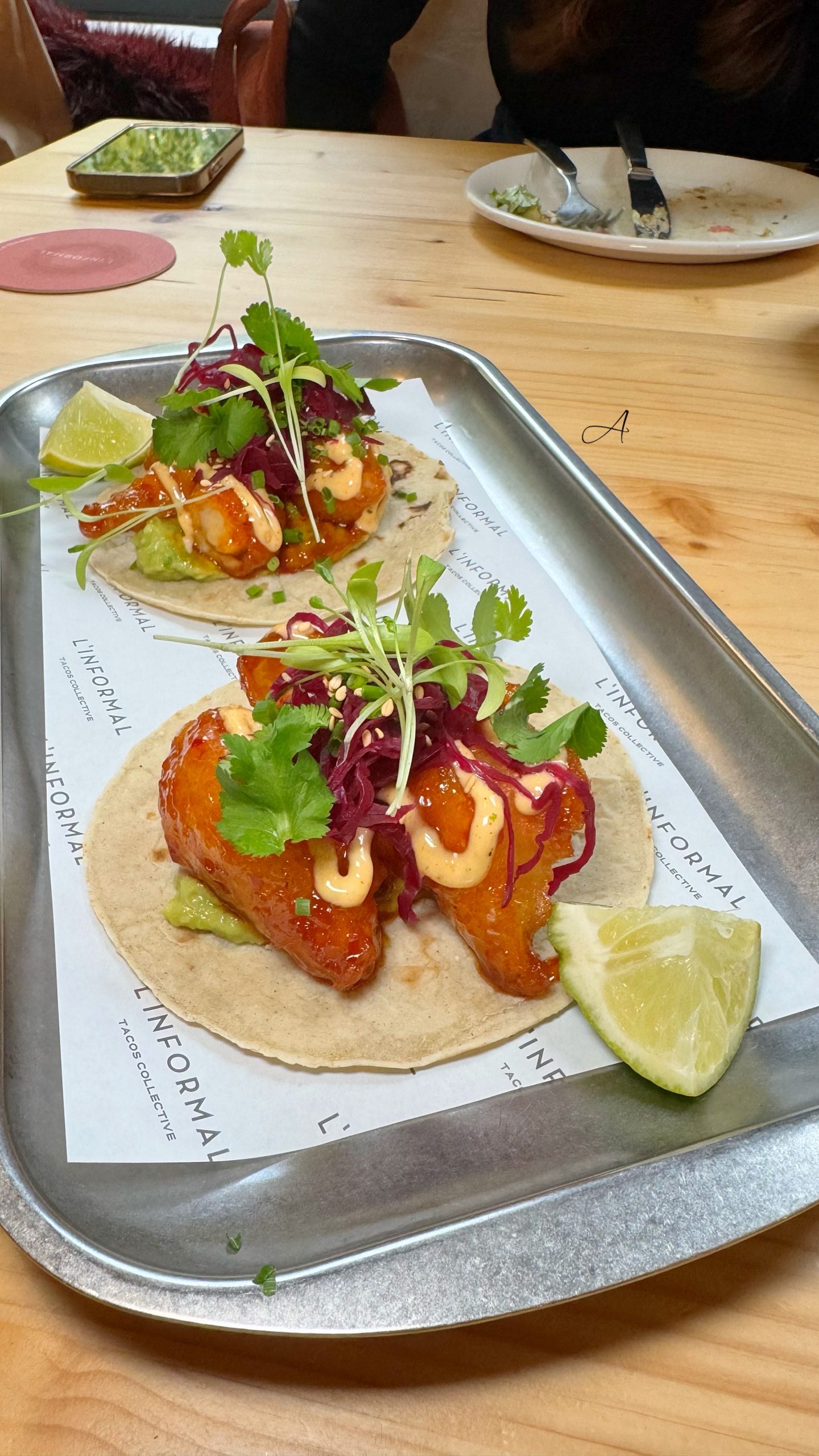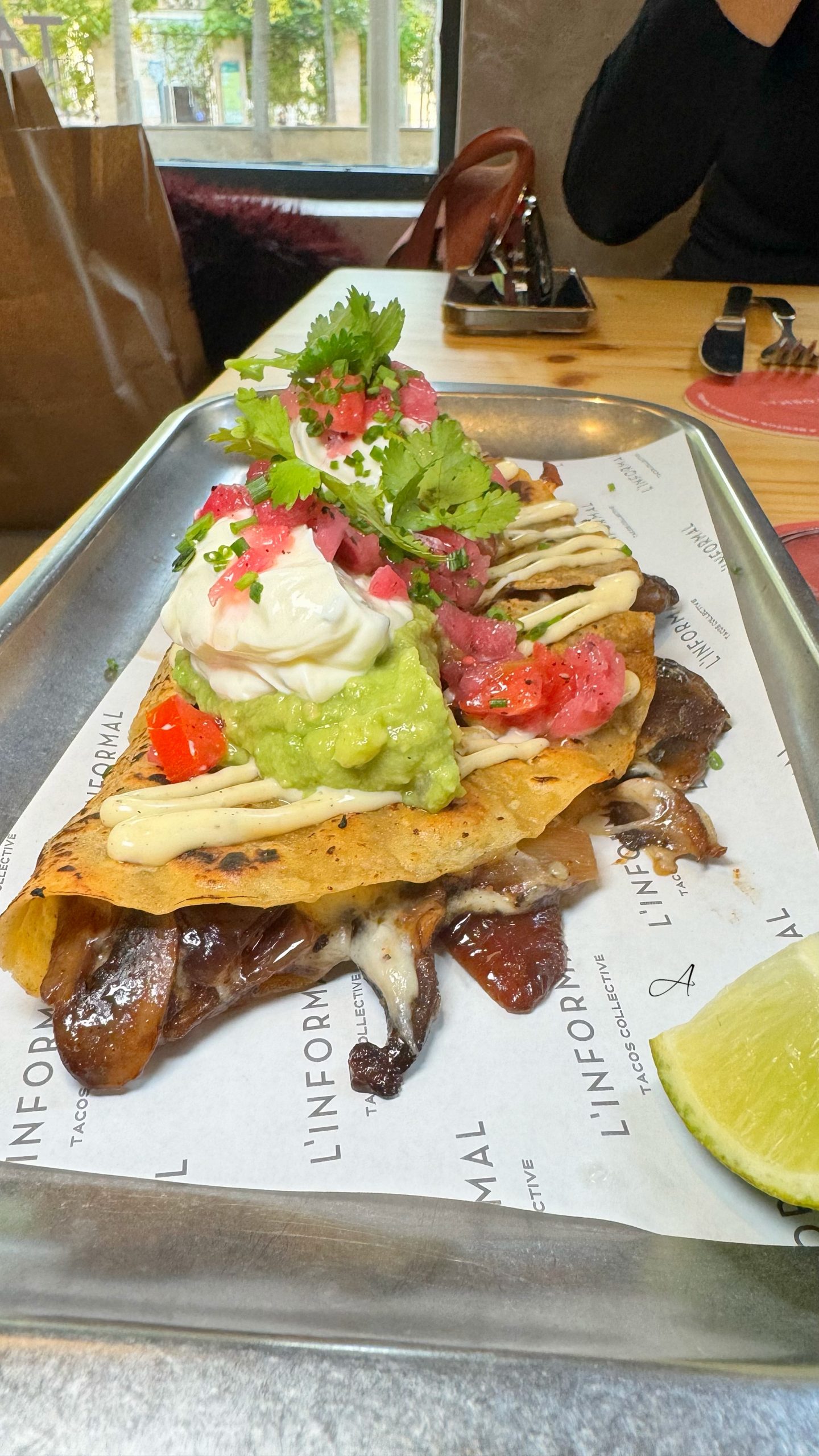 Tortilla rellena de sofrito de champiñones, queso, guacamole, pico de gallo y crema de lima (9,50 €). Me pareció deliciosa y, sinceramente, no eché en falta la proteína animal. La volvería a pedir sin dudar.