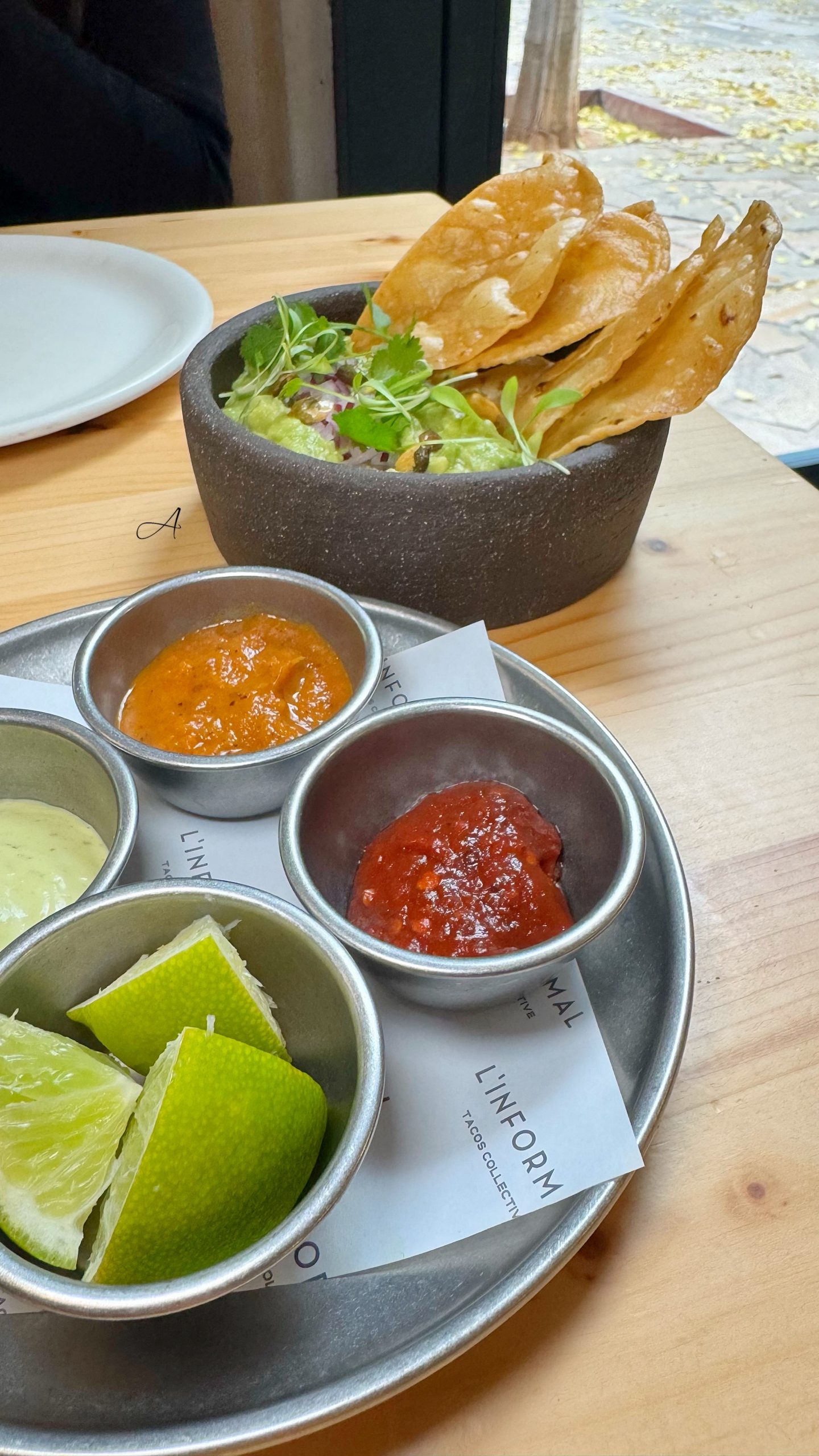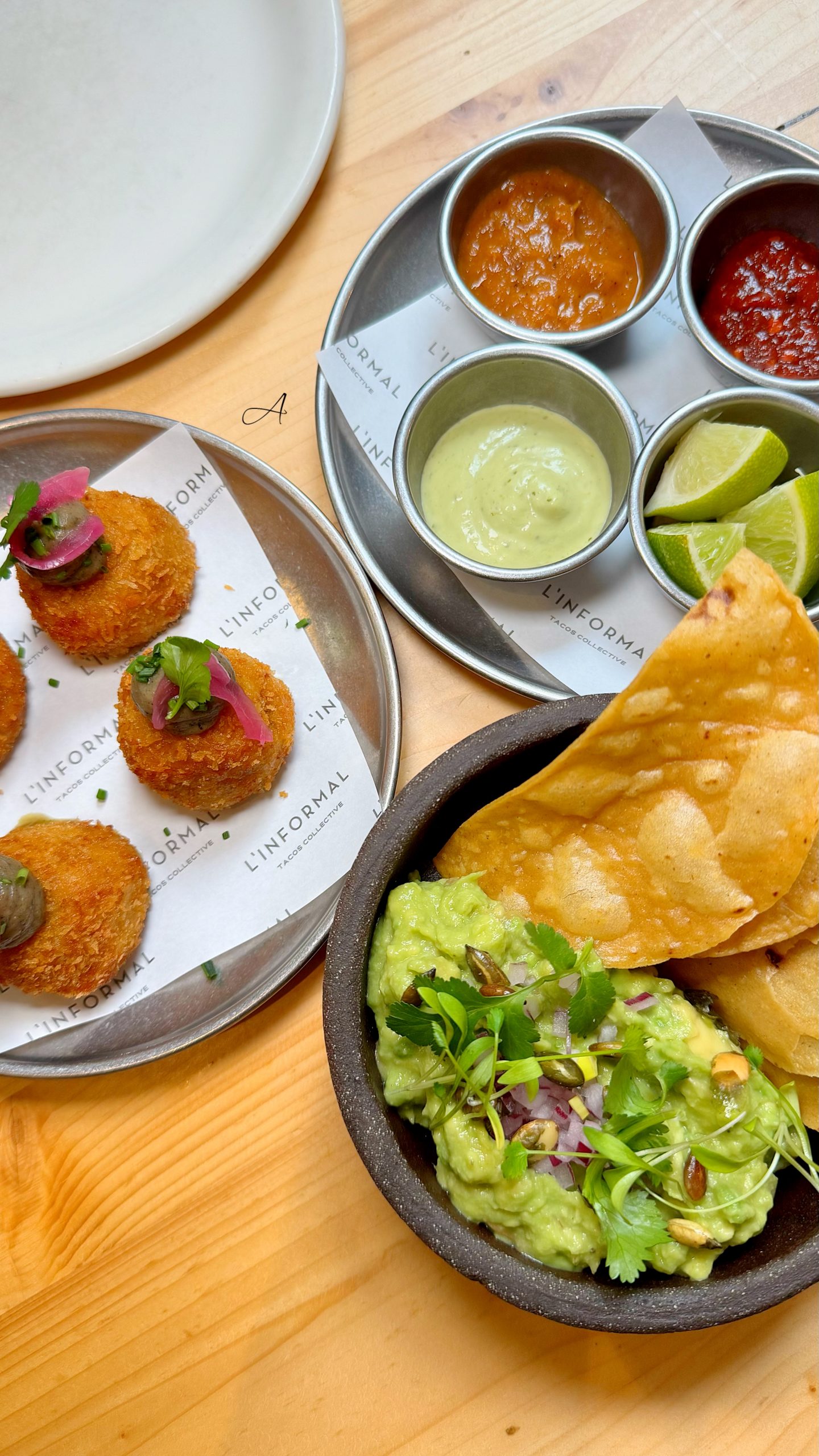 Servidos con salsa chipotle, salsa verde con jalapeños y una salsa de tomate y comino. Un entrante perfecto para abrir boca, con salsas muy adictivas y diferentes niveles de picante.