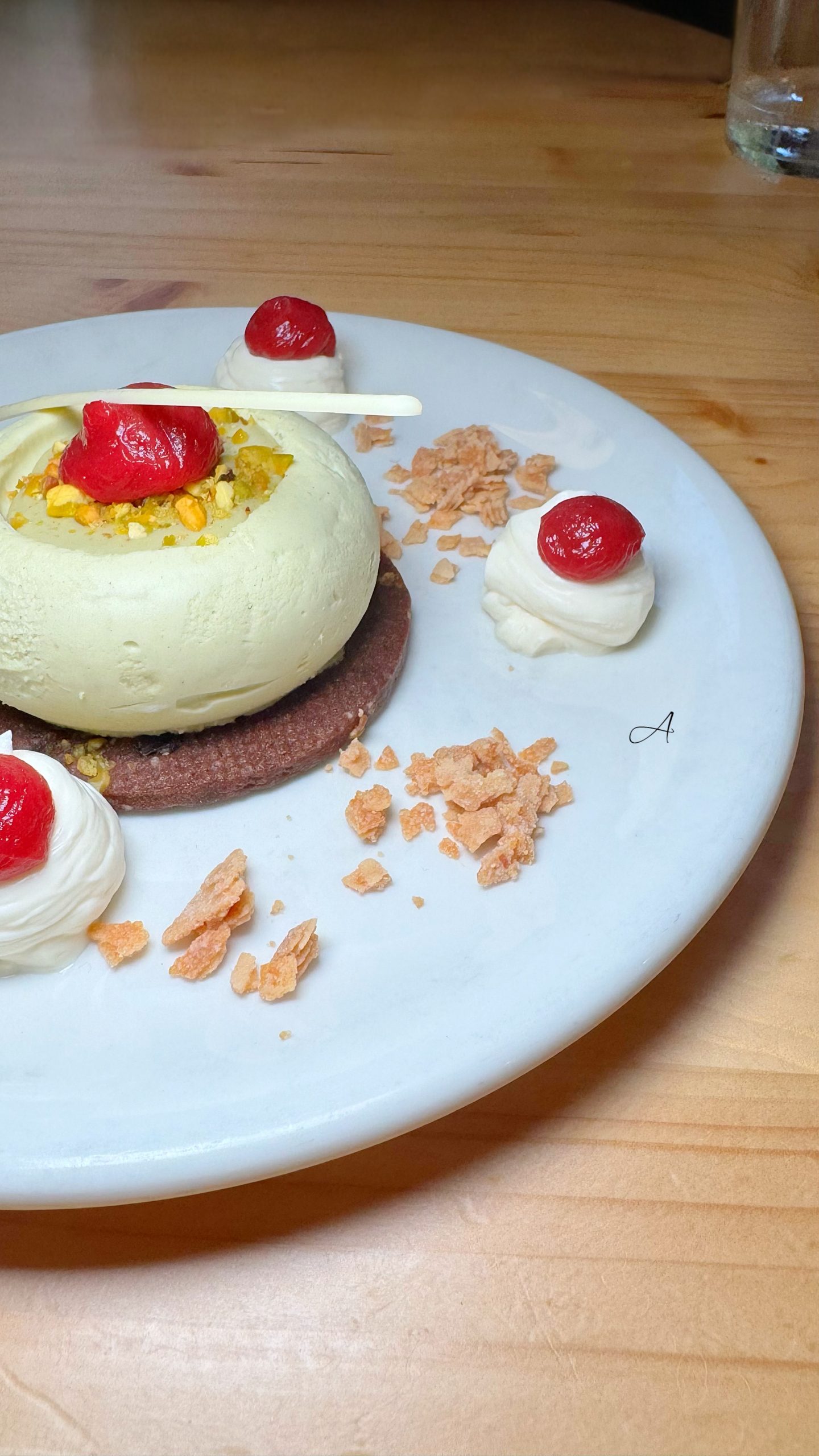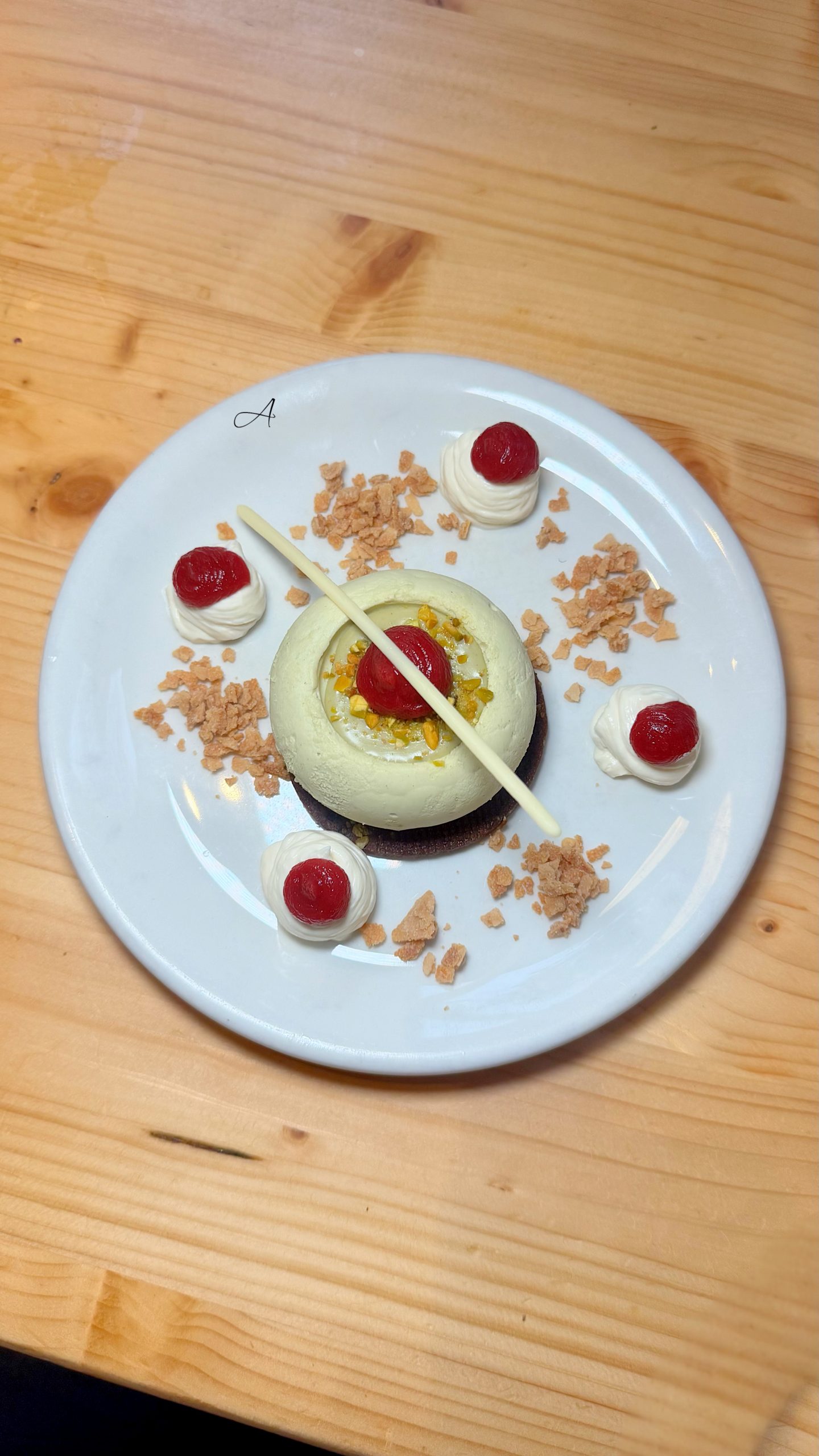 Ganache de pistacho, gel de frambuesa y cremoso de chocolate blanco (7,90 €). Me encantó: sorprende por sus texturas y por su auténtico sabor a pistacho. Es casera del obrador Motivos Palma, ¡que me fascina!