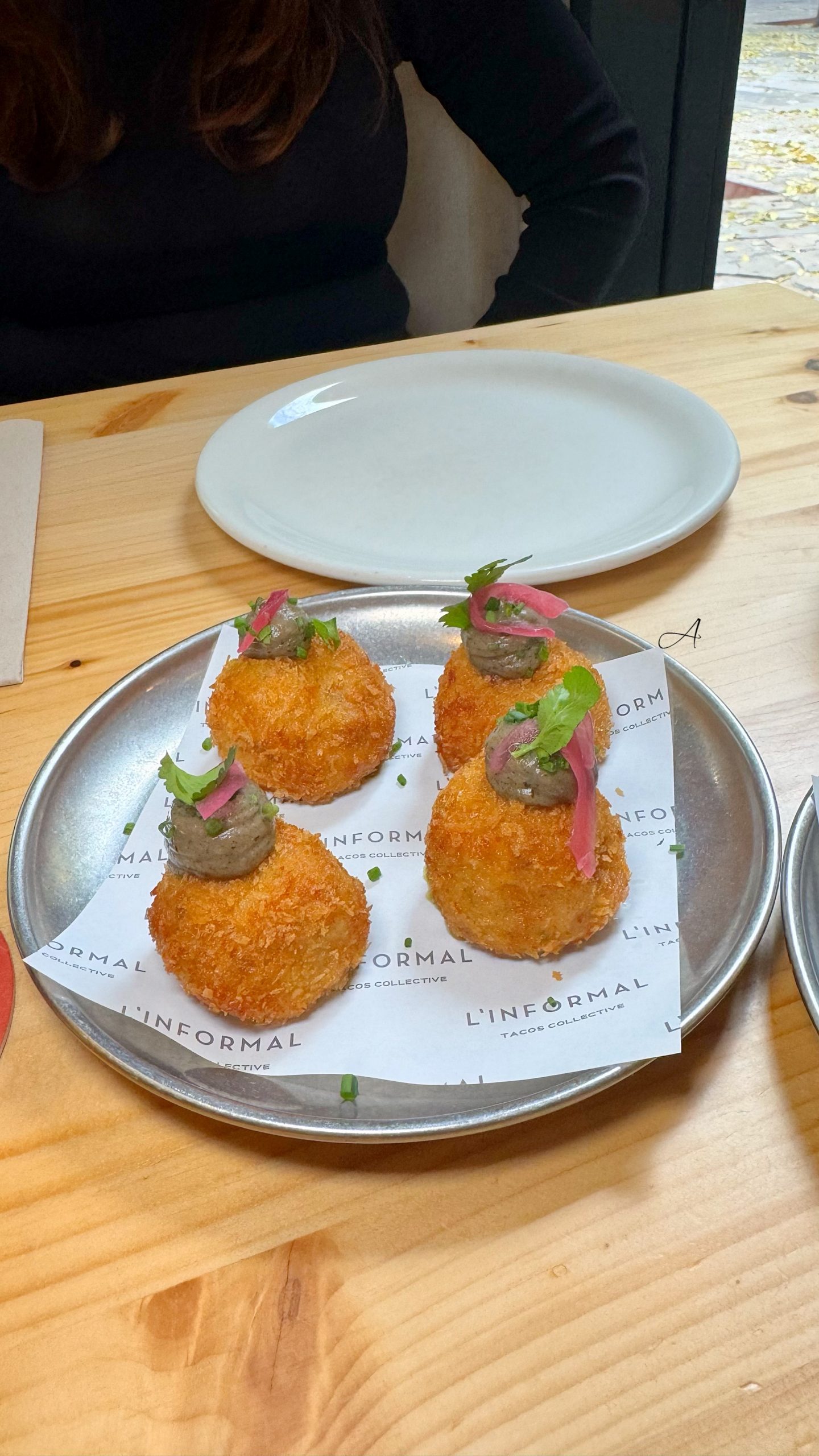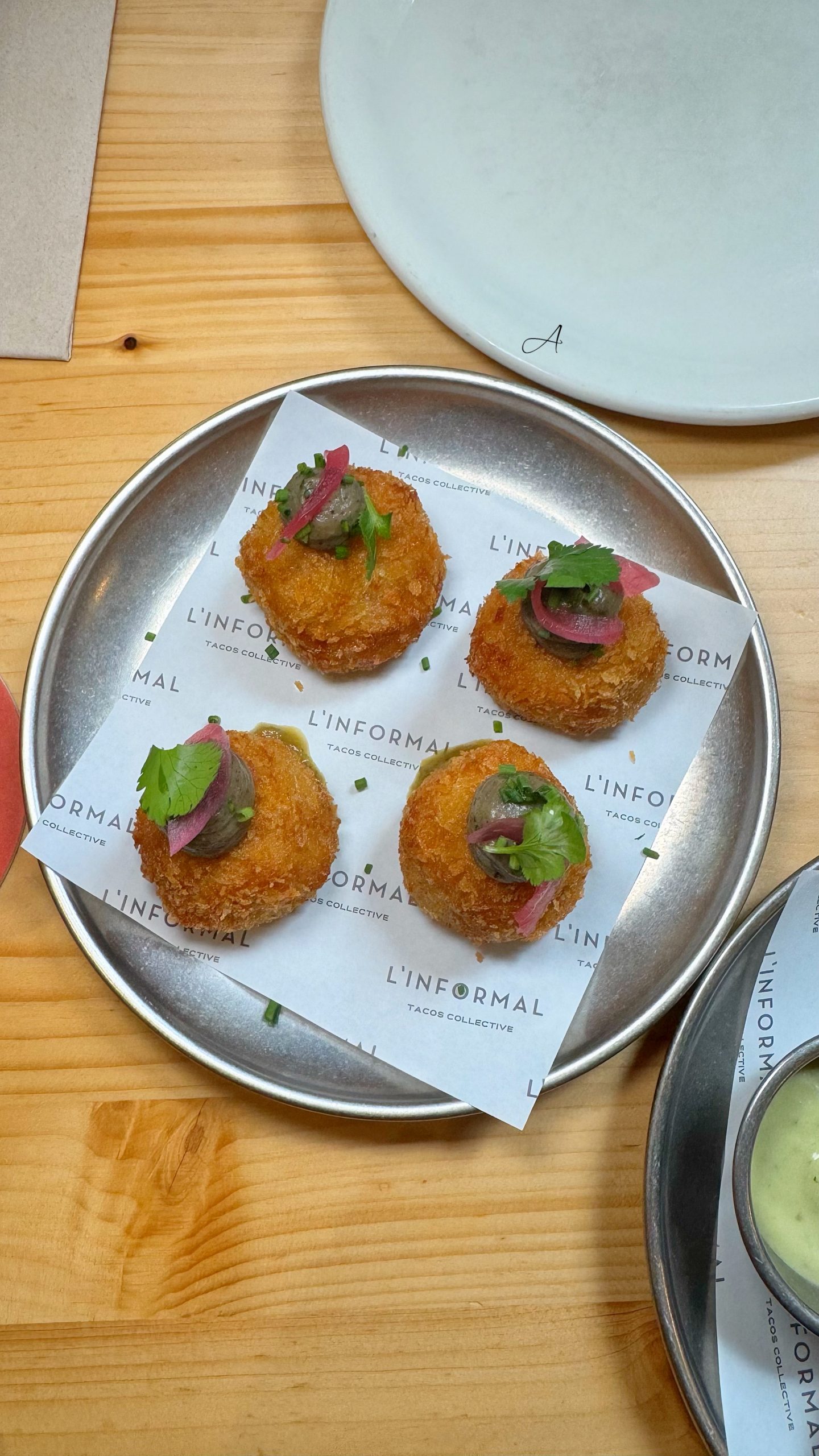 Tinga de pollo, emulsión de berenjenas tatemadas y salsa de tomatillo verde asado (7,50 € / 4 unidades). Cremosas por dentro y extremadamente sabrosas.