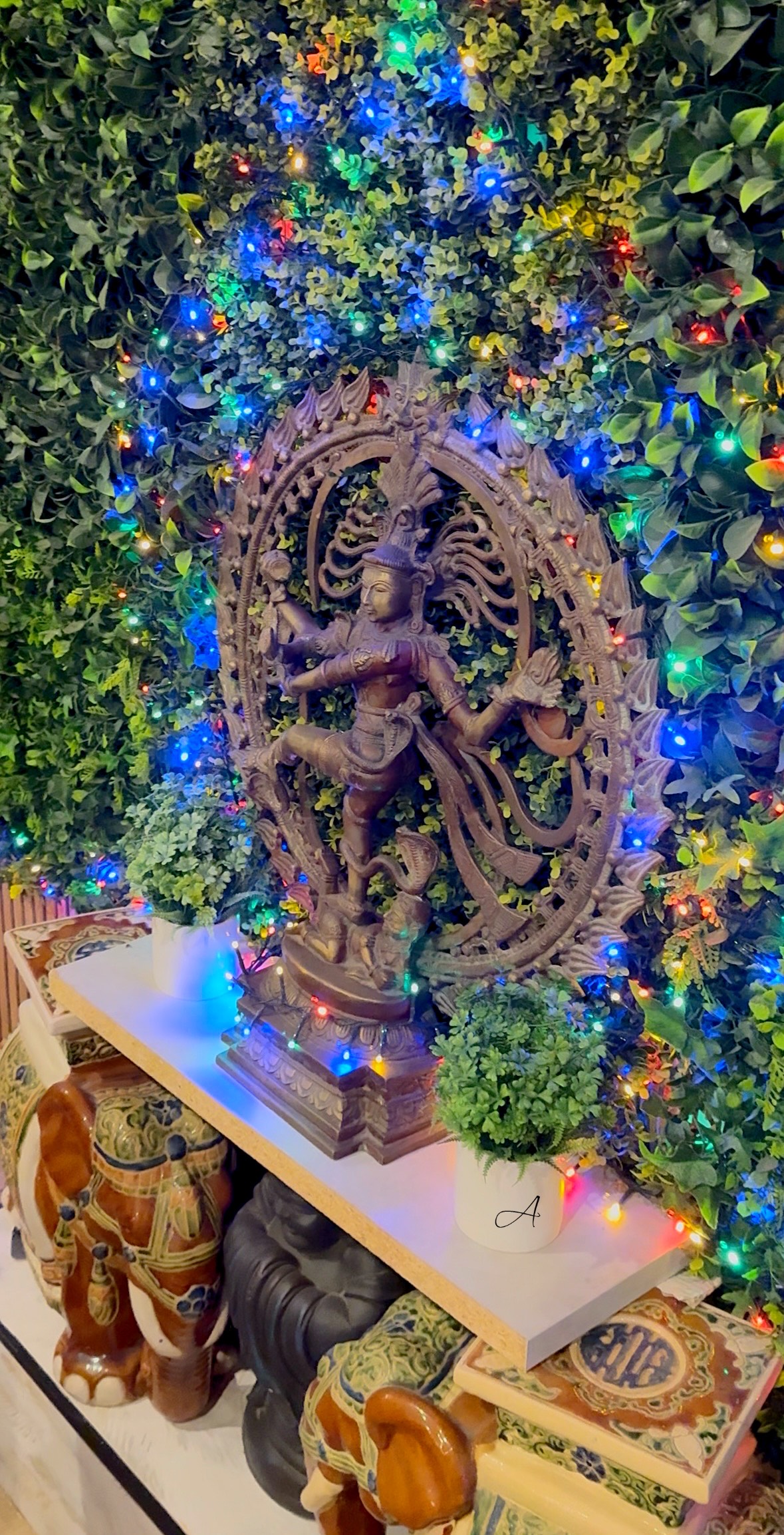 El servicio fue rápido y amable. El local está muy bien ambientado, con una preciosa escultura de Shiva y un jardín vertical que aporta frescura y un toque especial al espacio.