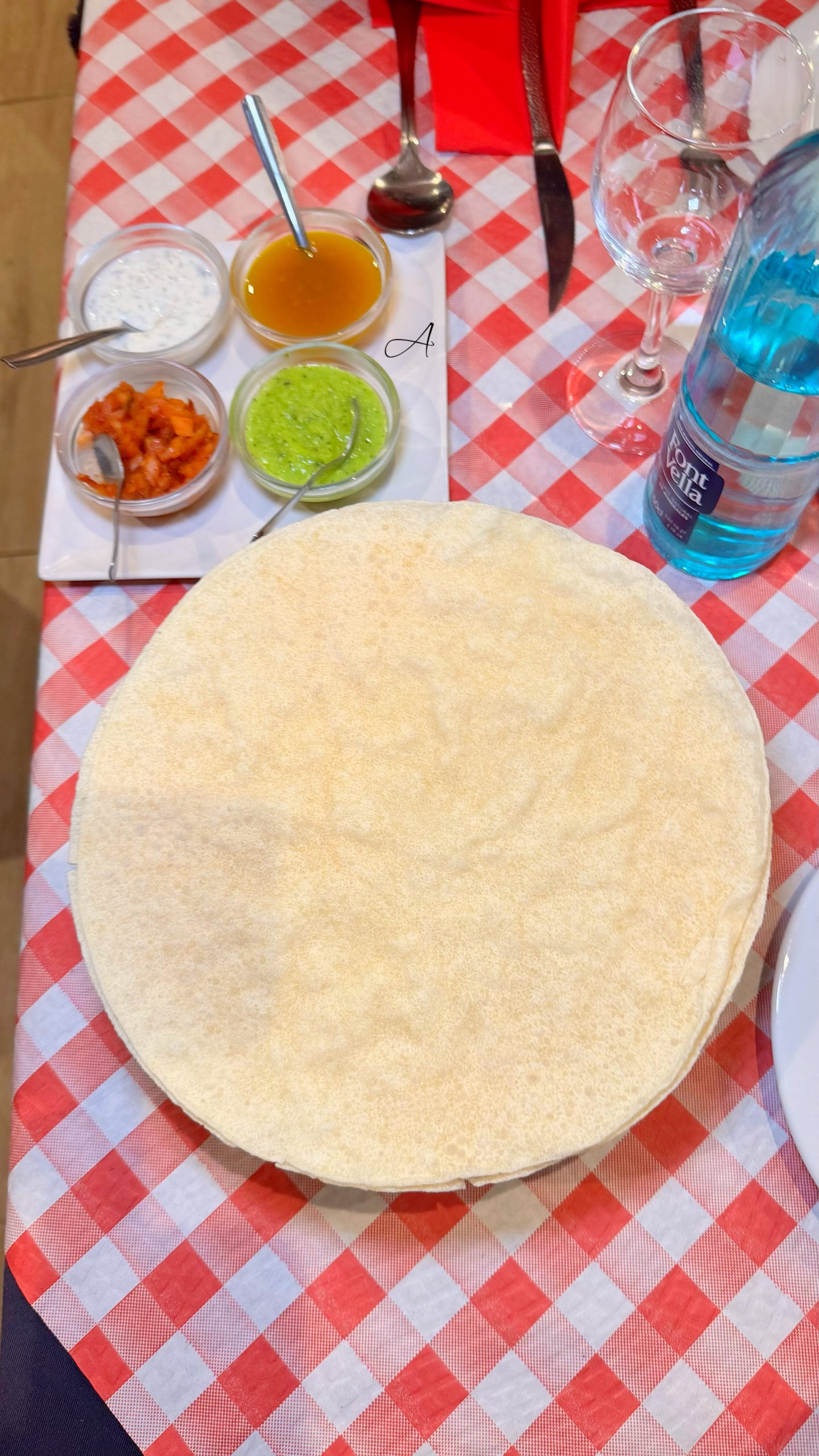 Pan crujiente de lentejas de origen indio servido como aperitivo. Lo acompañan con diferentes salsas: yogur, mango, picante y aguacate. Riquísimo.