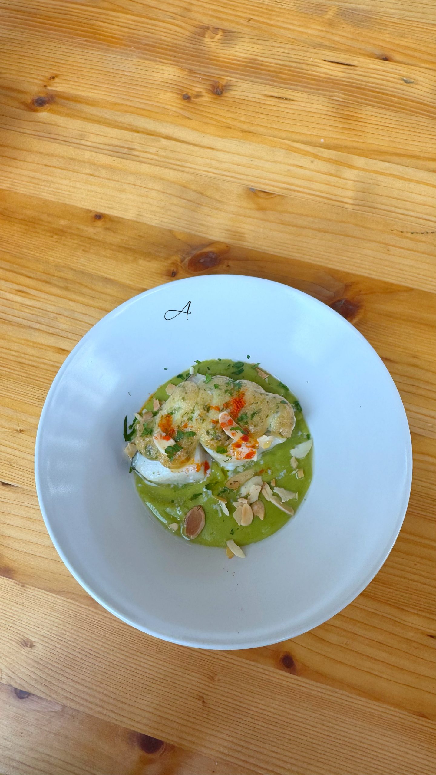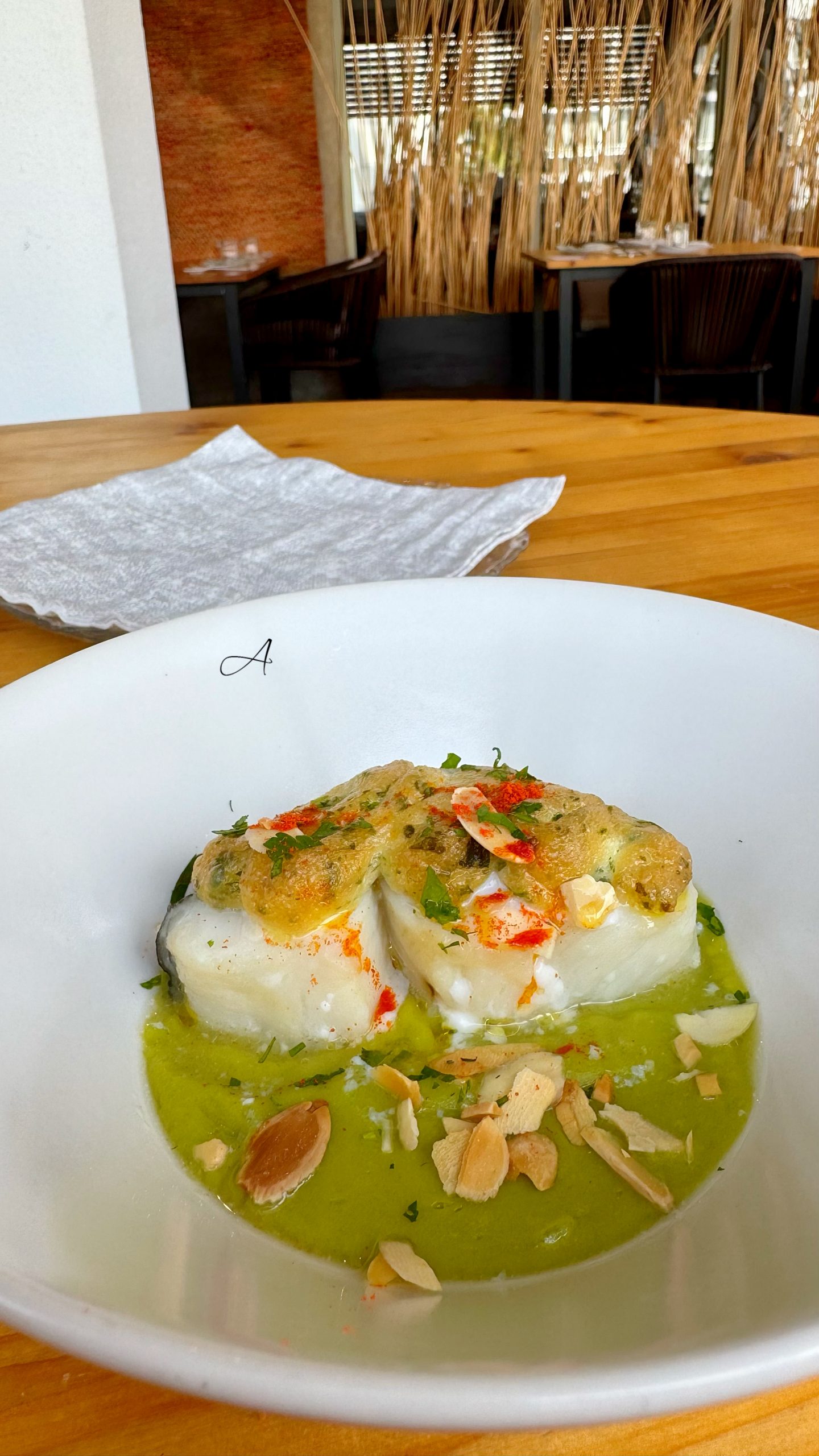 - Bacalao gratinado con crema de guisantes, un plato elegante donde el punto del pescado y la cremosidad juegan en perfecta armonía.
