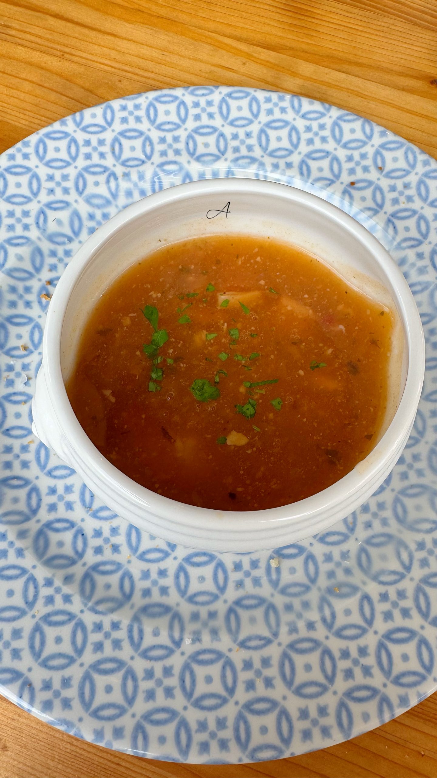 - Sopa de pescado con un sutil toque de licor de hierbas mallorquinas, que aporta profundidad y carácter.