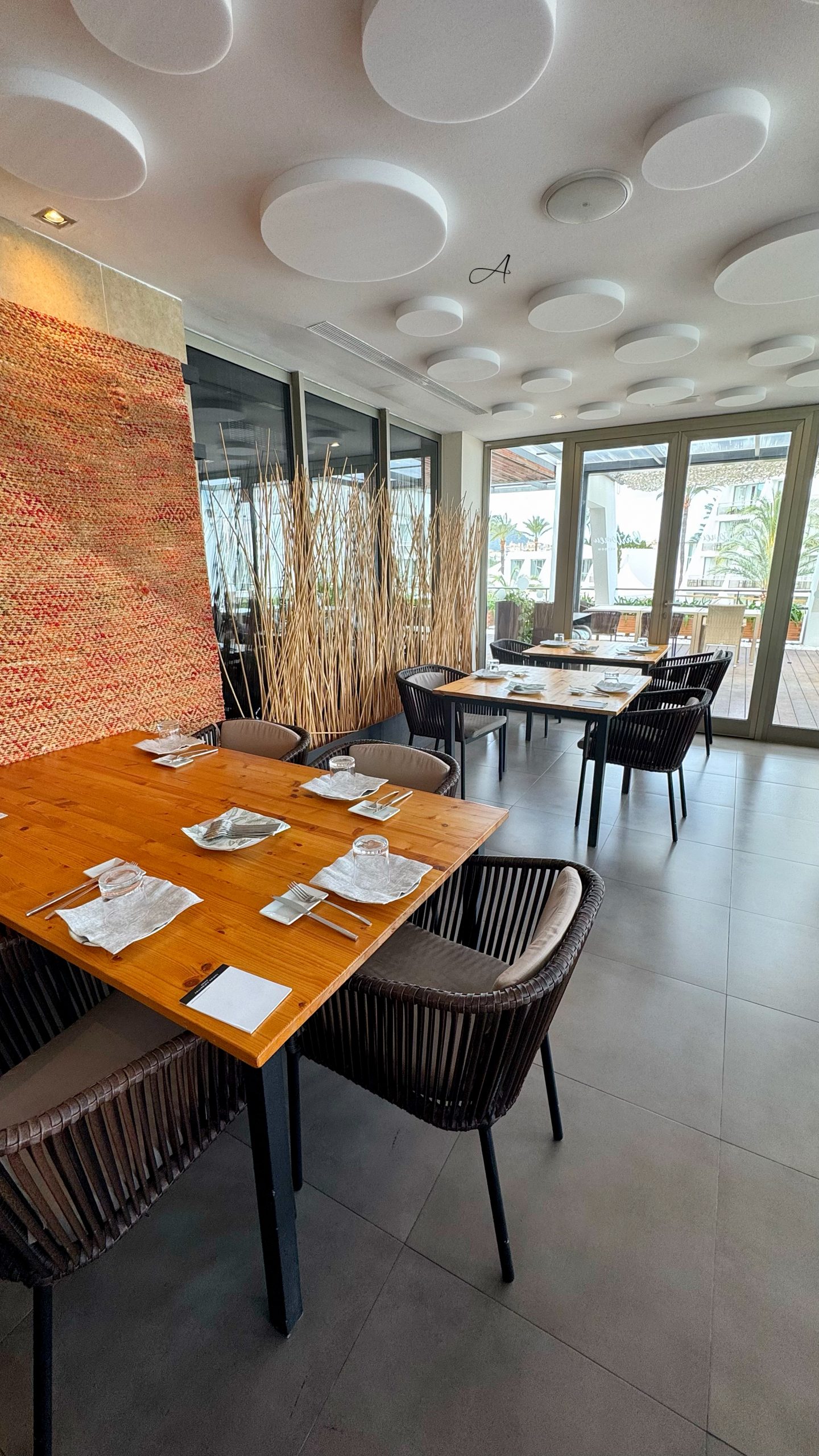 El espacio acompaña esa filosofía: abierto, mediterráneo, sin artificios. La cocina vista refuerza la transparencia y convierte cada servicio en parte del espectáculo.