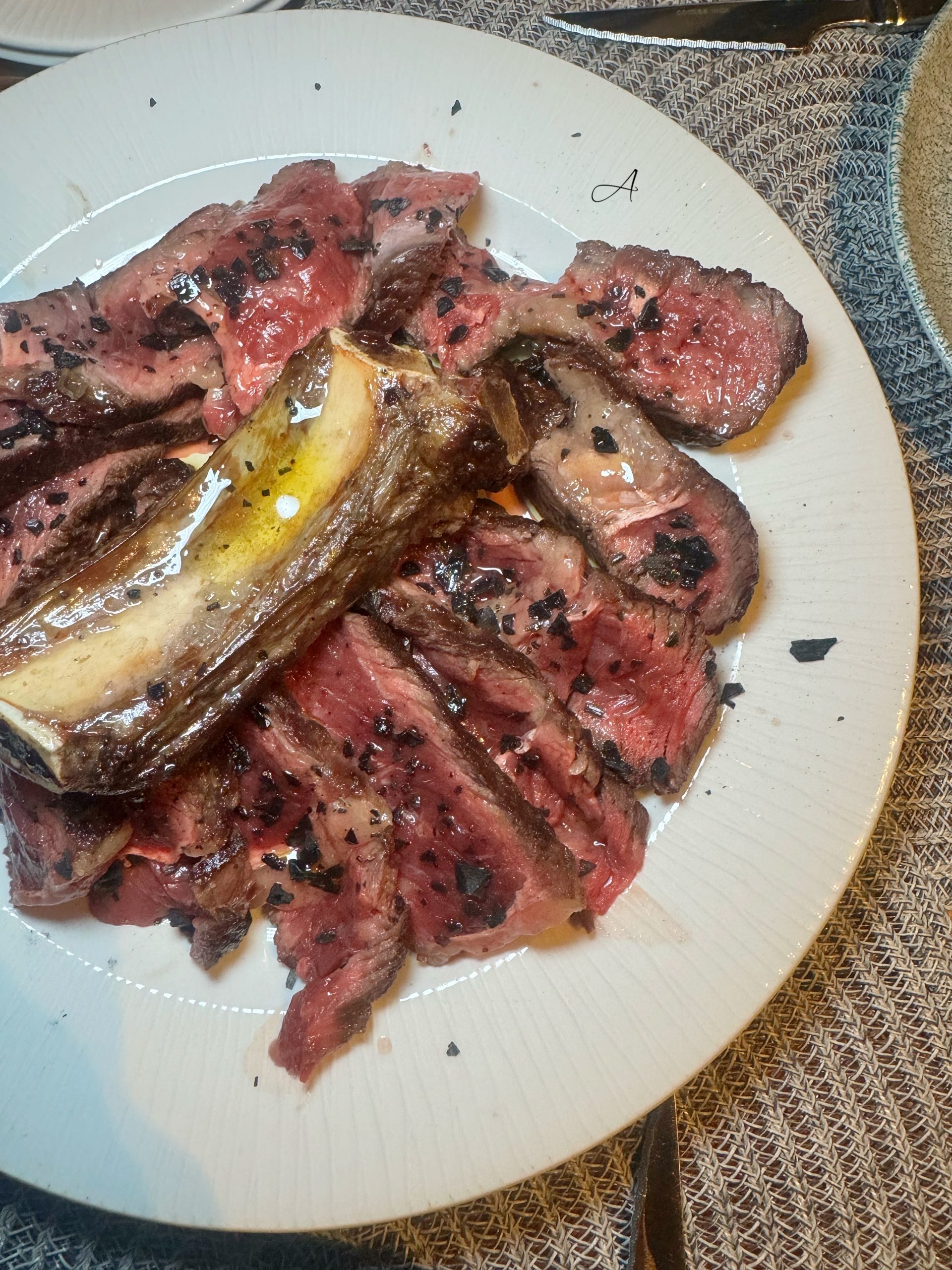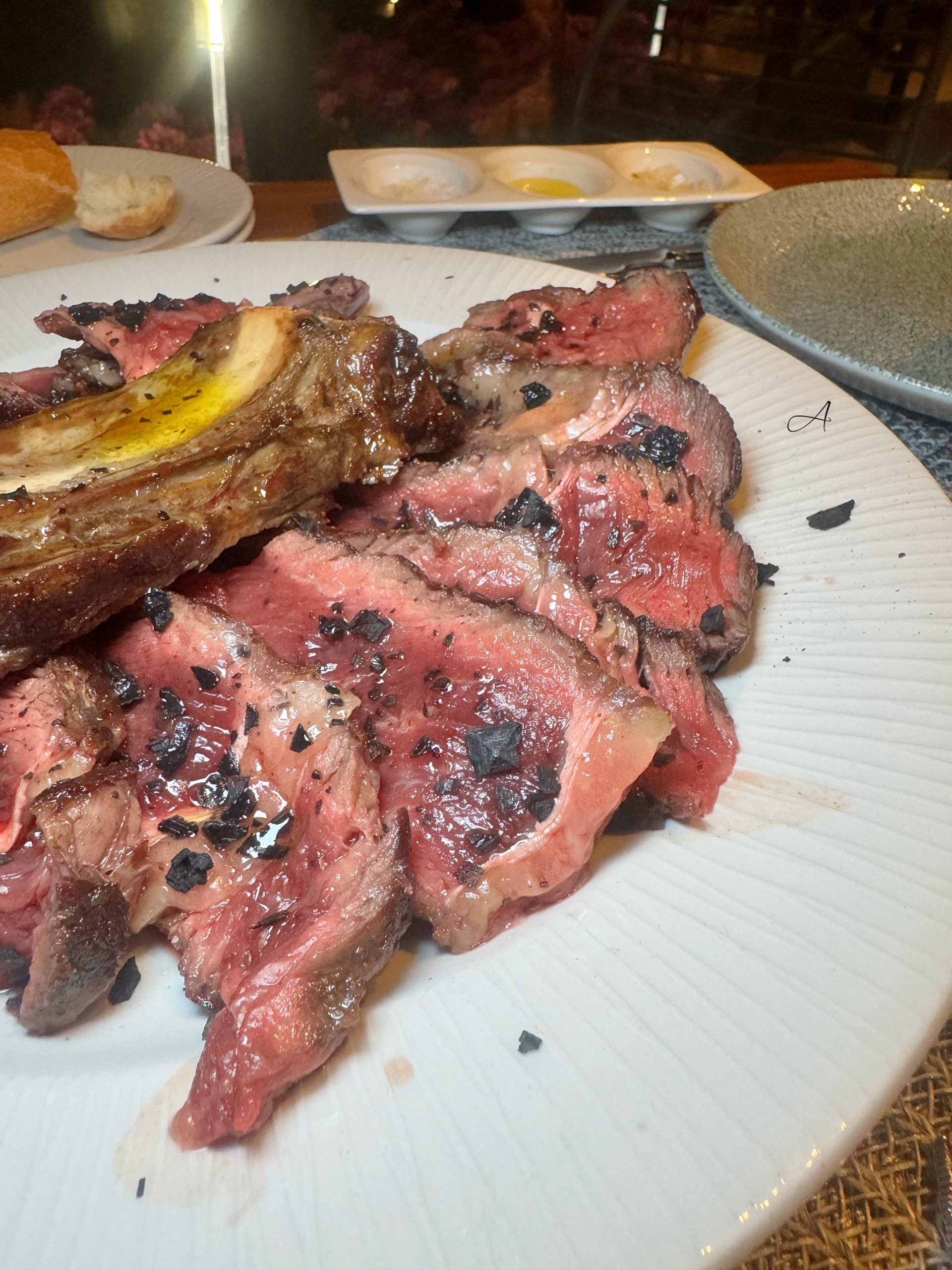 - Chuletón para dos personas (95€), acompañado de ensalada verde (6€) y patató (6€), con opción de salsa de pimienta verde o BBQ de albaricoque (3€ cada una). Una carne de ternera sabrosa y deliciosa con el punto de cocción idoneo. (Carne en la carta de los domingos)