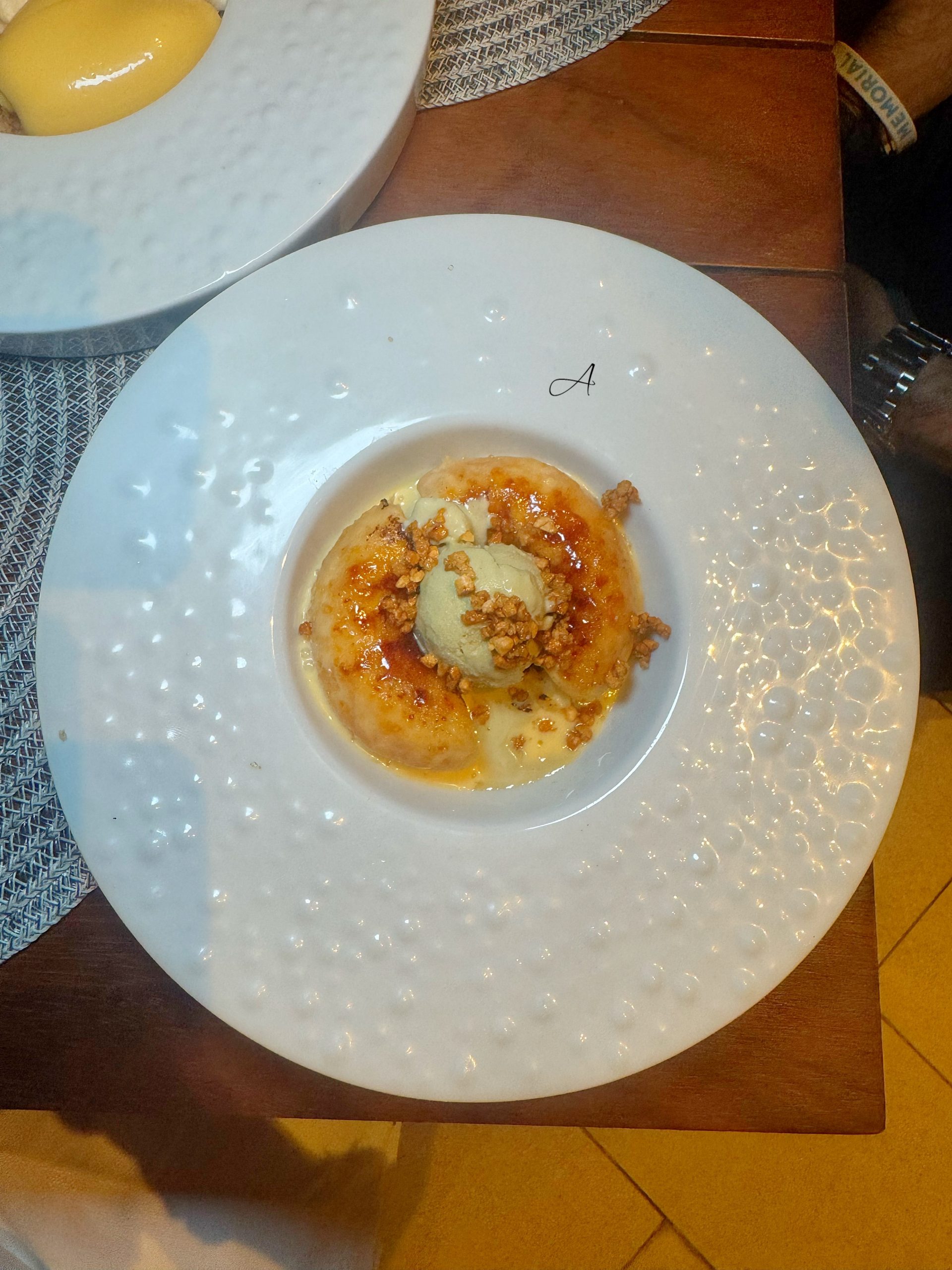 - Torrija de masa de donut con crema de naranja y helado de pistacho (8’20€). Diferente y deliciosa, con un contraste espectacular. (Plato de carta)