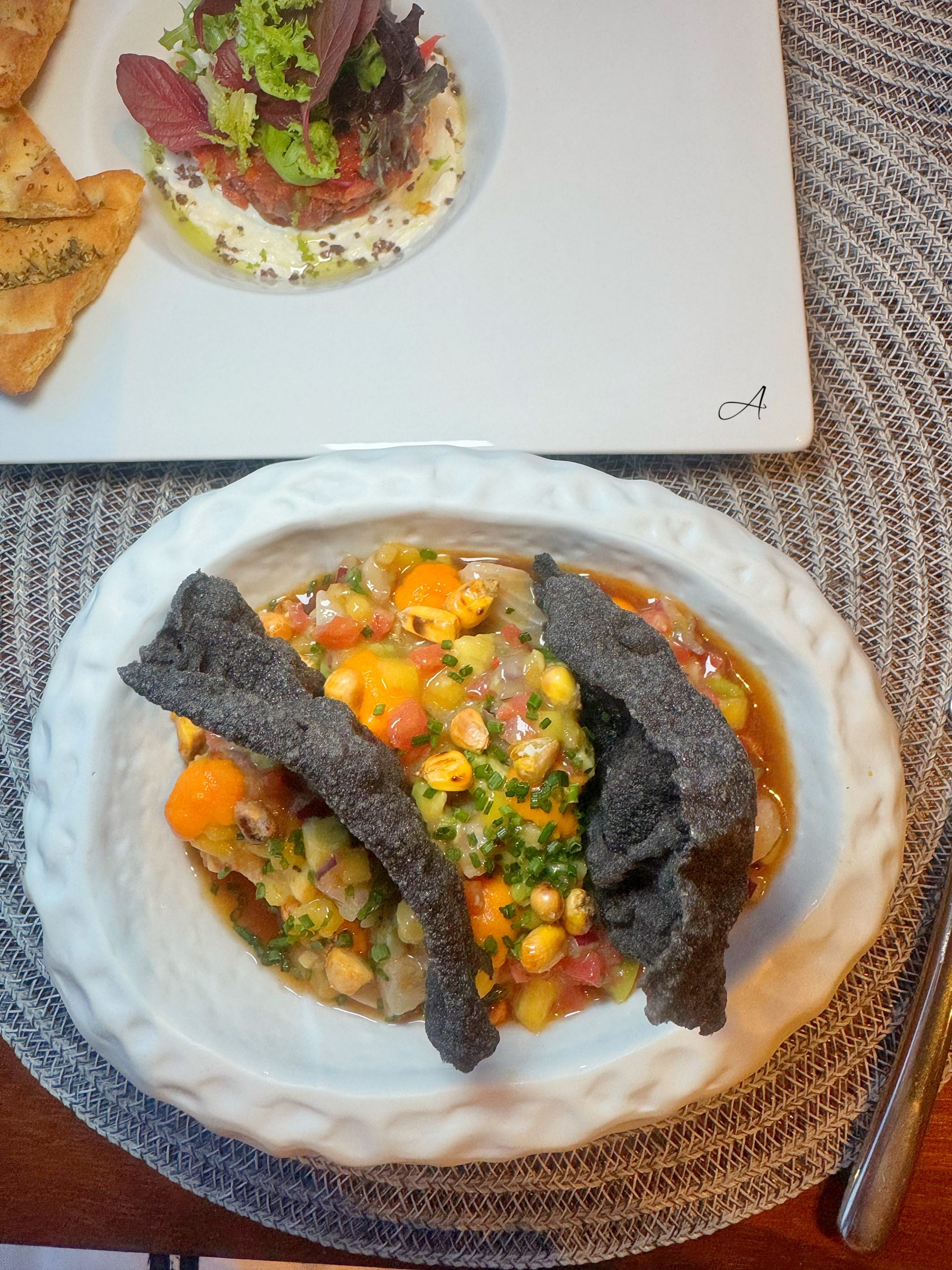 - Ceviche de corvina con boniato y maíz crujiente (19’50€). Perfectamente marinado, uno de los imprescindibles. (Plato de carta)