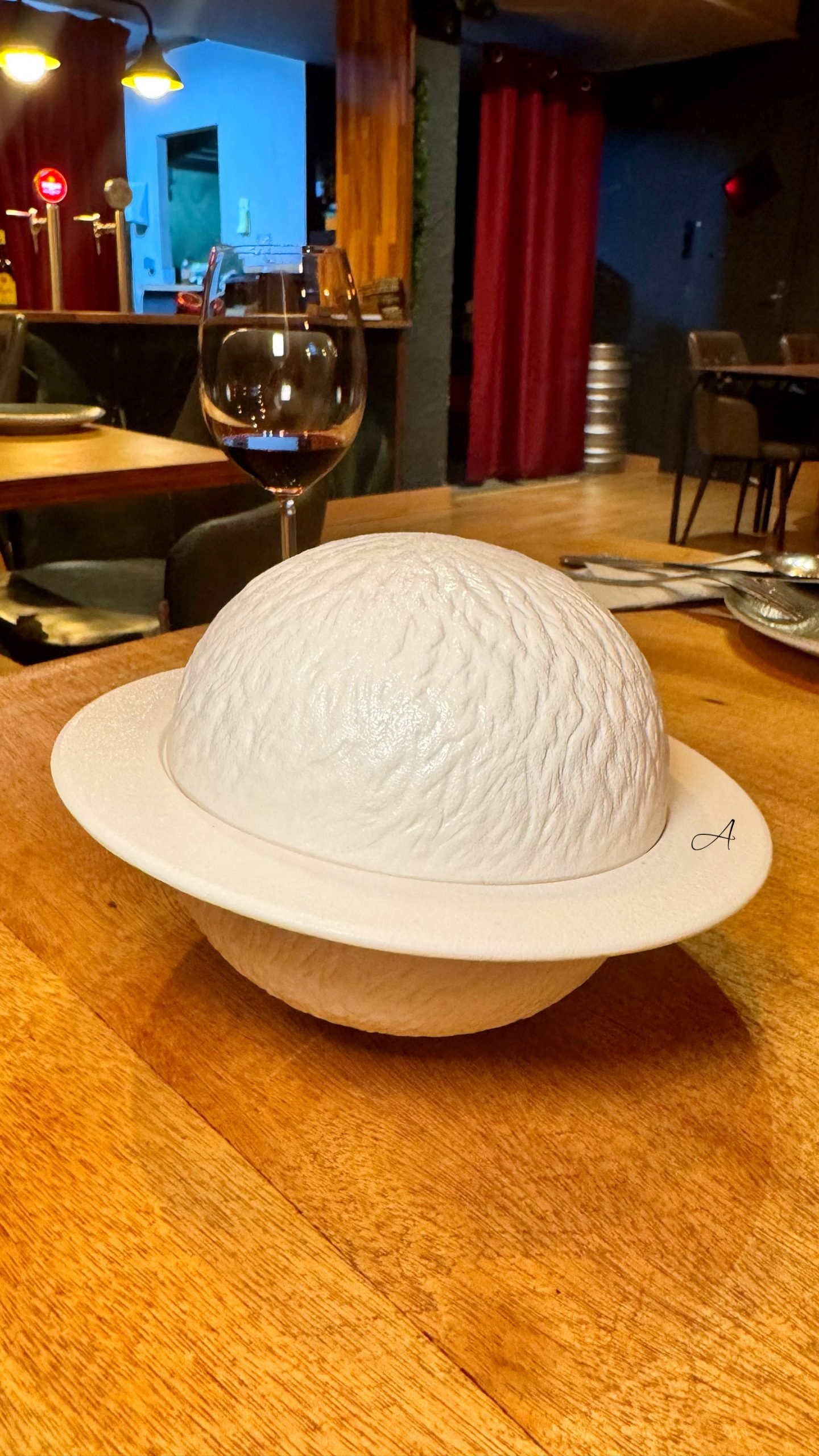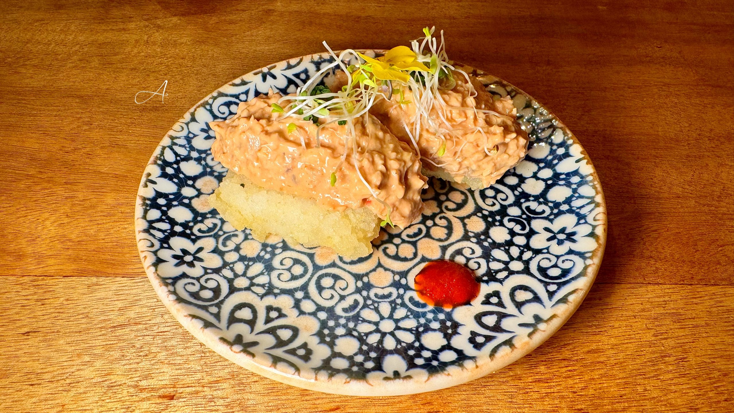 Un clásico andaluz llevado a versión tapa. Coliflor melosa, comino, pimentón y ajo dorado en un homenaje a la cocina humilde bien hecha. Reconfortante, sabrosa y con alma. Además, servida en un plato con forma de planeta Saturno que suma personalidad.