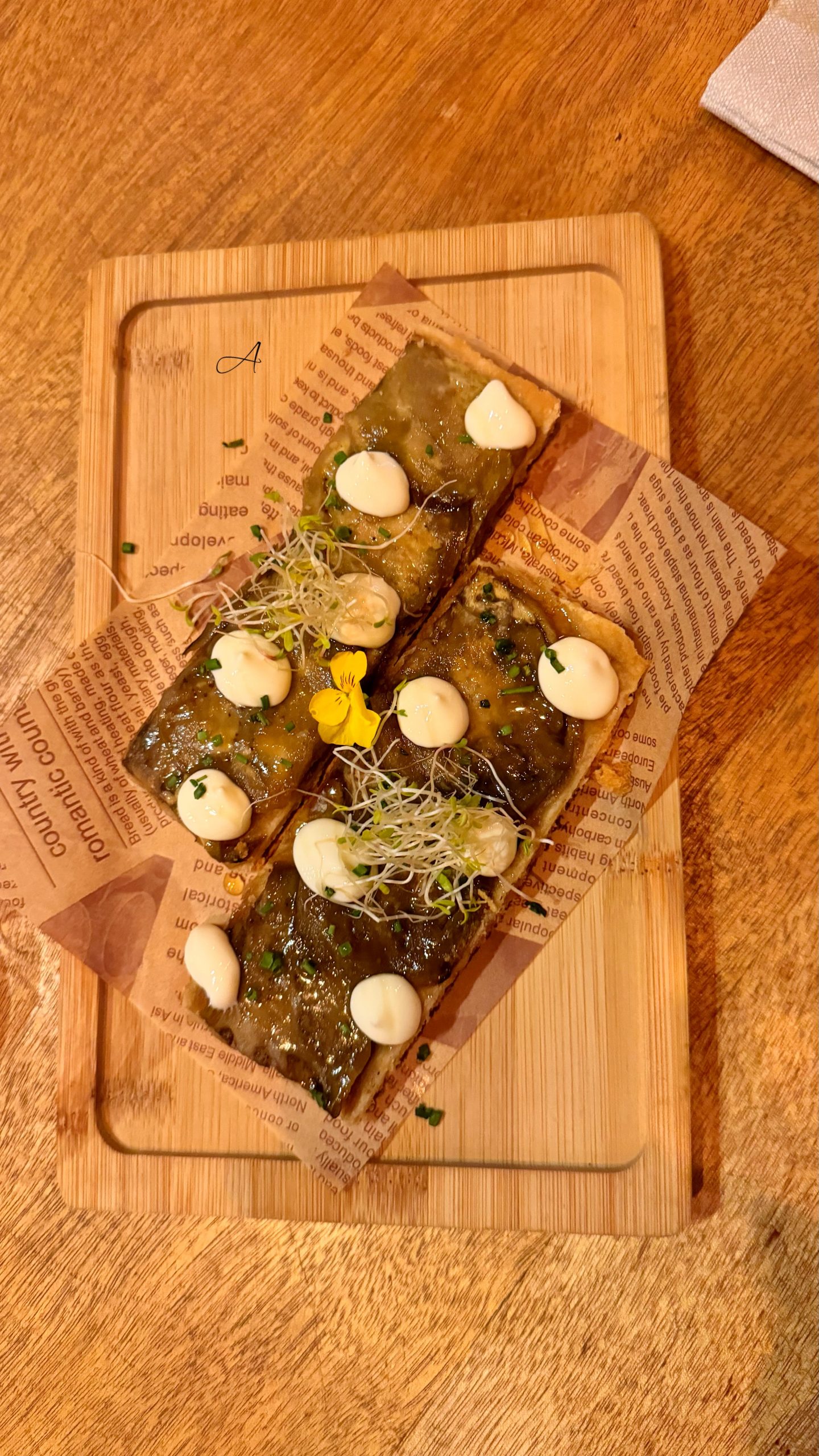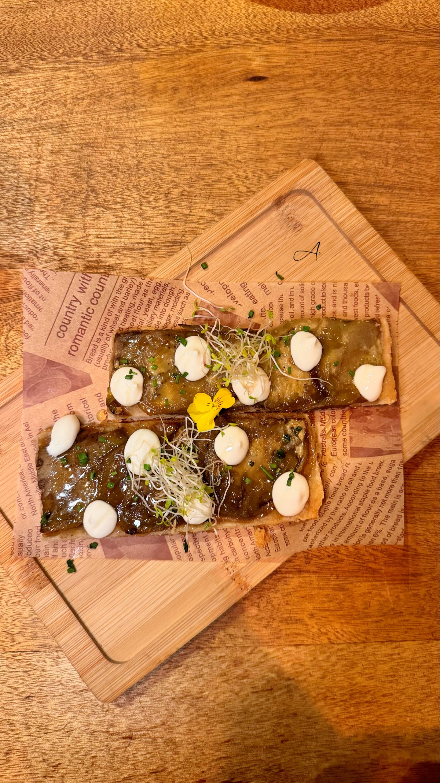 - Coca Xeixa de berenjena asada, crema de queso y miel (4€/2 ud)